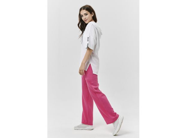 Туника прямая, свободная, с капюшоном, с удлиненной спинкой. Рукав короткий, с декоративными элементами вдоль рукава. В нижней части боковых швов обработаны разрезы.