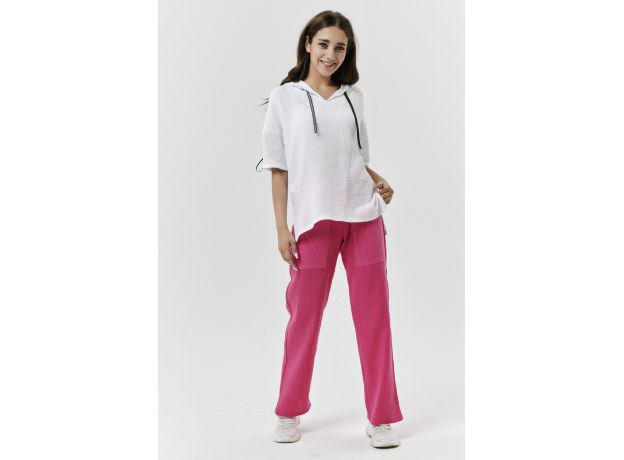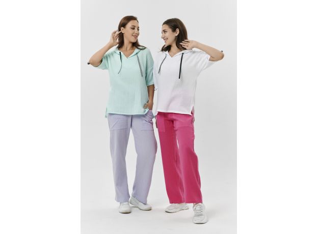 Туника прямая, свободная, с капюшоном, с удлиненной спинкой. Рукав короткий, с декоративными элементами вдоль рукава. В нижней части боковых швов обработаны разрезы.