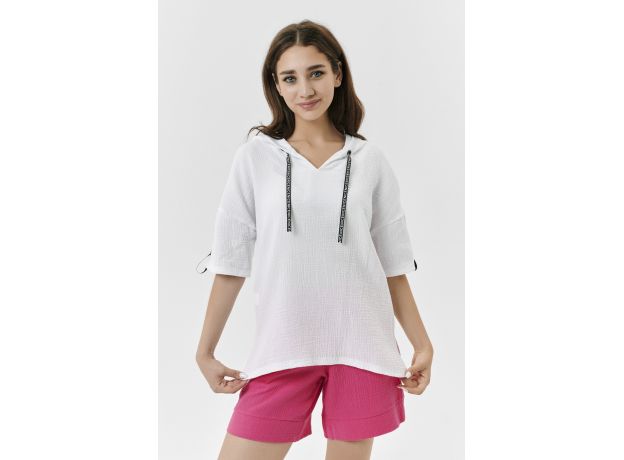 Туника прямая, свободная, с капюшоном, с удлиненной спинкой. Рукав короткий, с декоративными элементами вдоль рукава. В нижней части боковых швов обработаны разрезы.