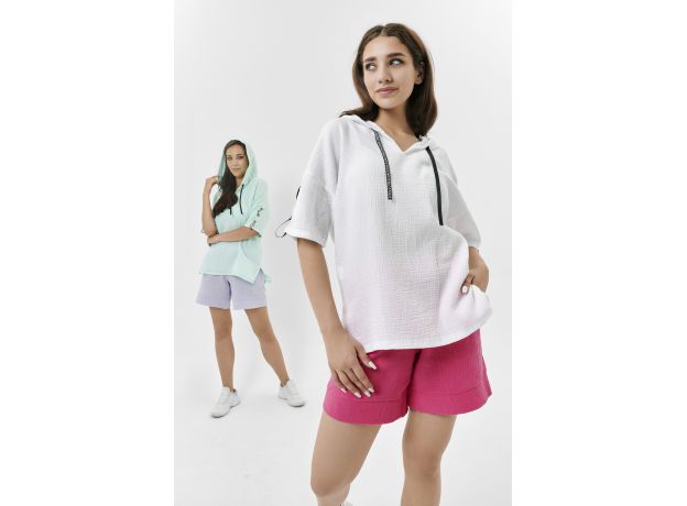 Туника прямая, свободная, с капюшоном, с удлиненной спинкой. Рукав короткий, с декоративными элементами вдоль рукава. В нижней части боковых швов обработаны разрезы.