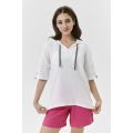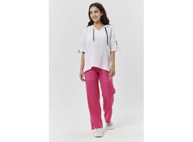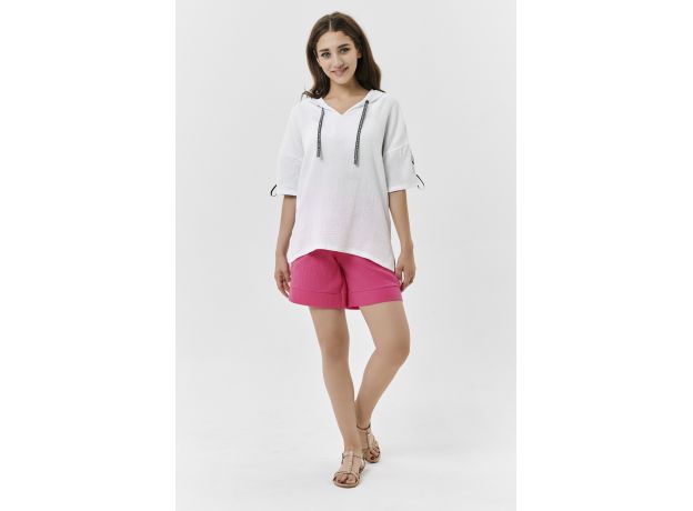 Туника прямая, свободная, с капюшоном, с удлиненной спинкой. Рукав короткий, с декоративными элементами вдоль рукава. В нижней части боковых швов обработаны разрезы.