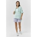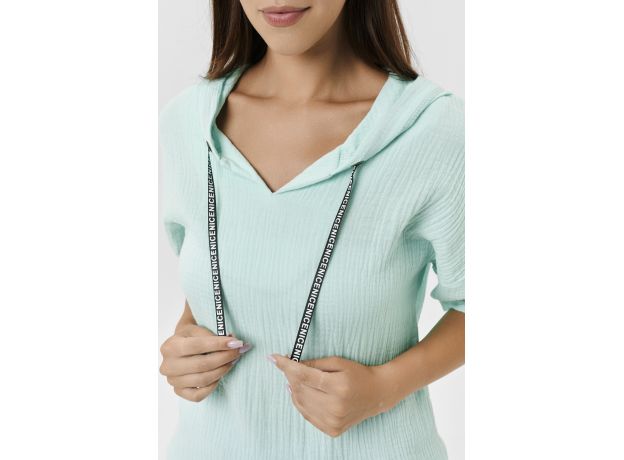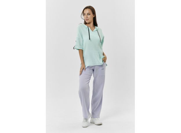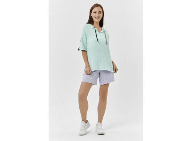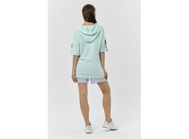 Туника прямая, свободная, с капюшоном, с удлиненной спинкой. Рукав короткий, с декоративными элементами вдоль рукава. В нижней части боковых швов обработаны разрезы.