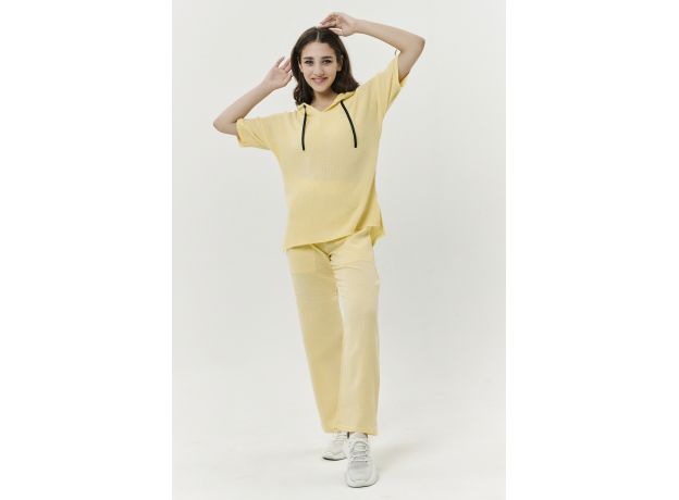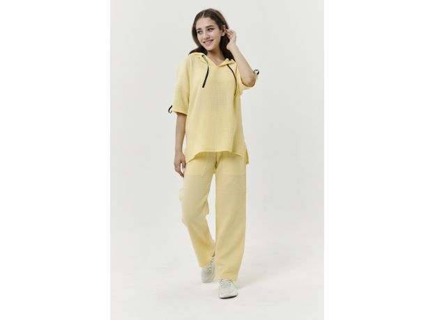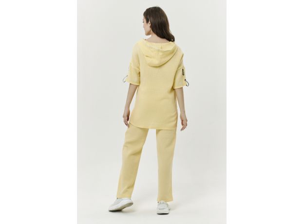 Туника прямая, свободная, с капюшоном, с удлиненной спинкой. Рукав короткий, с декоративными элементами вдоль рукава. В нижней части боковых швов обработаны разрезы.