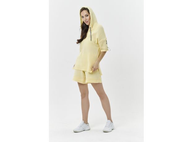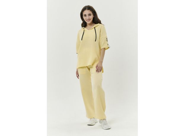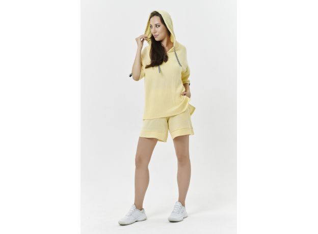Туника прямая, свободная, с капюшоном, с удлиненной спинкой. Рукав короткий, с декоративными элементами вдоль рукава. В нижней части боковых швов обработаны разрезы.