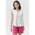 Женская туника-майка на пуговицах, без рукавов, свободная, с удлиненной спинкой и фигурной линией низа. По шву соединения кокеток с полочкой расположены декоративные клапаны. Спинка с кокеткой и складкой. Горловина спинки и проймы обработаны бейкой из основного полотна.
