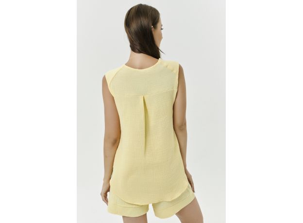 Женская туника-майка на пуговицах, без рукавов, свободная, с удлиненной спинкой и фигурной линией низа. По шву соединения кокеток с полочкой расположены декоративные клапаны. Спинка с кокеткой и складкой. Горловина спинки и проймы обработаны бейкой из основного полотна.