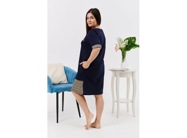 Туника прямого силуэта, с V-образной горловиной, с карманами в боковых швах. Рукав короткий, с манжетом из отделочной ткани. Низ полочки завершен деталью из отделочного полотна.
