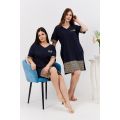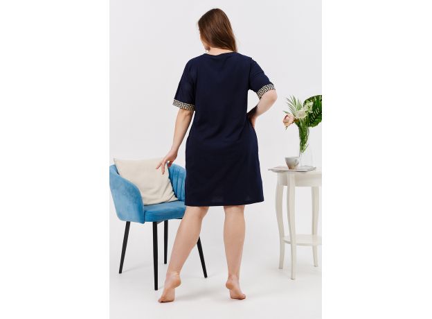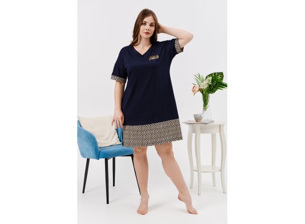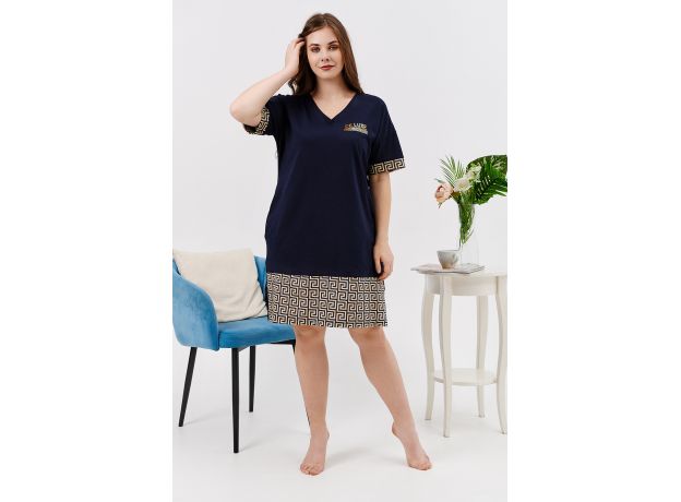 Туника прямого силуэта, с V-образной горловиной, с карманами в боковых швах. Рукав короткий, с манжетом из отделочной ткани. Низ полочки завершен деталью из отделочного полотна. В нижней части боковых швов обработаны разрезы. Горловина обработана обтачкой из основного полотна.