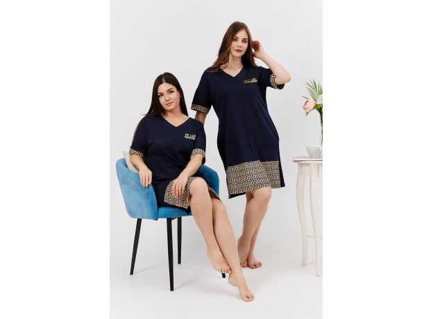 Туника прямого силуэта, с V-образной горловиной, с карманами в боковых швах. Рукав короткий, с манжетом из отделочной ткани. Низ полочки завершен деталью из отделочного полотна. В нижней части боковых швов обработаны разрезы. Горловина обработана обтачкой из основного полотна.