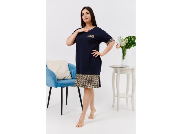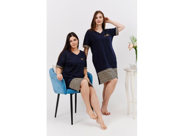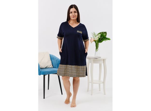Туника прямого силуэта, с V-образной горловиной, с карманами в боковых швах. Рукав короткий, с манжетом из отделочной ткани. Низ полочки завершен деталью из отделочного полотна. В нижней части боковых швов обработаны разрезы. Горловина обработана обтачкой из основного полотна.