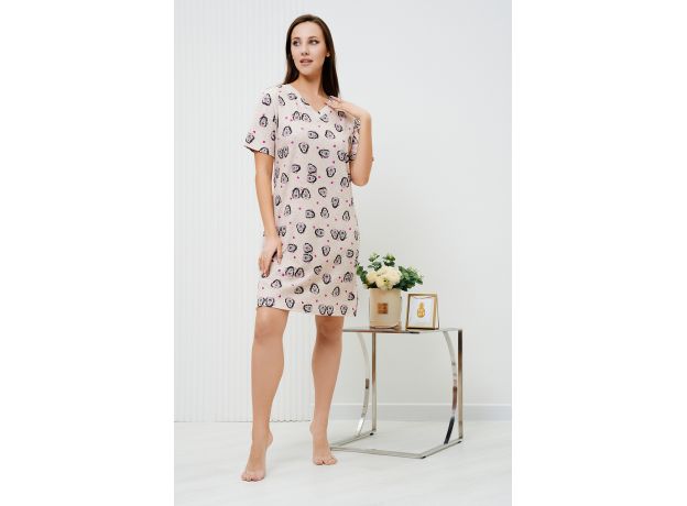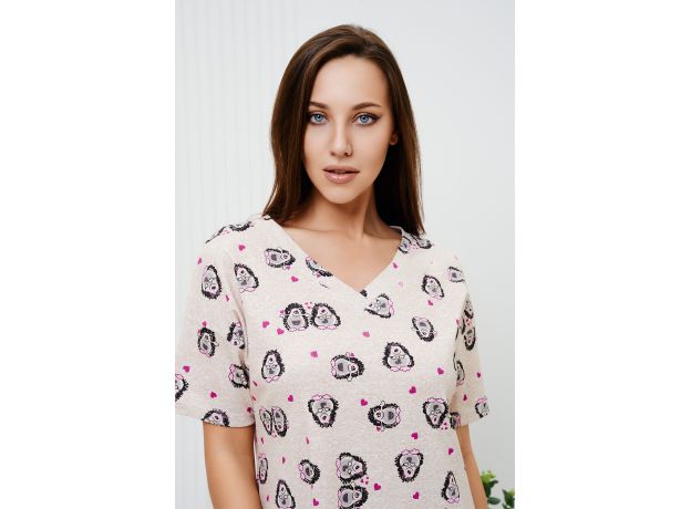 Туника прямого силуэта, с V-образной горловиной. Рукав короткий. Спинка с кокеткой. В нижней части боковых швов обработаны разрезы. Горловина обработана обтачкой из основного полотна.