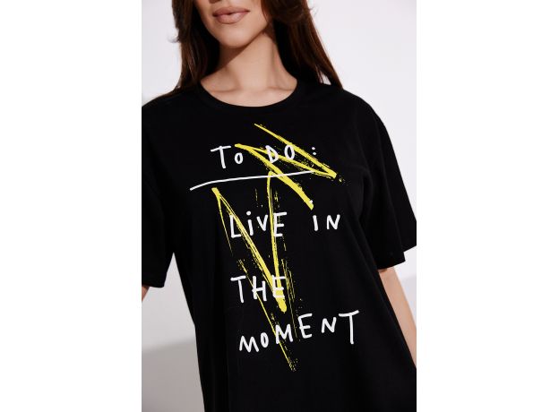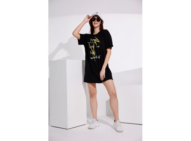 Туника - футболка в стиле оверсайз. Прямая, свободная, длиной выше колена, с округлой горловиной. Рукав короткий. Горловина обработана обтачкой из основного полотна.