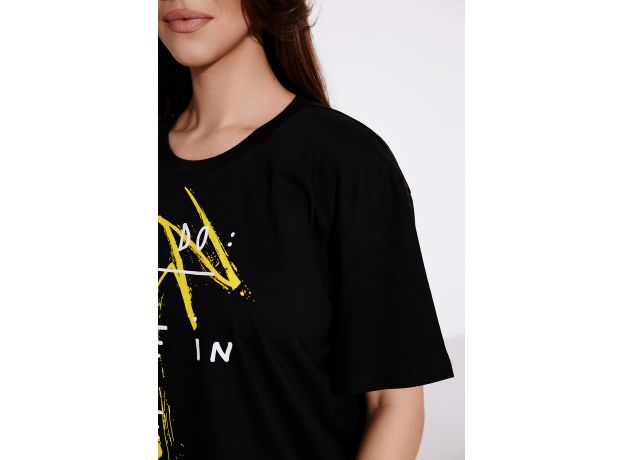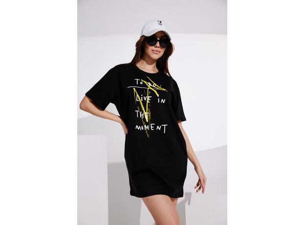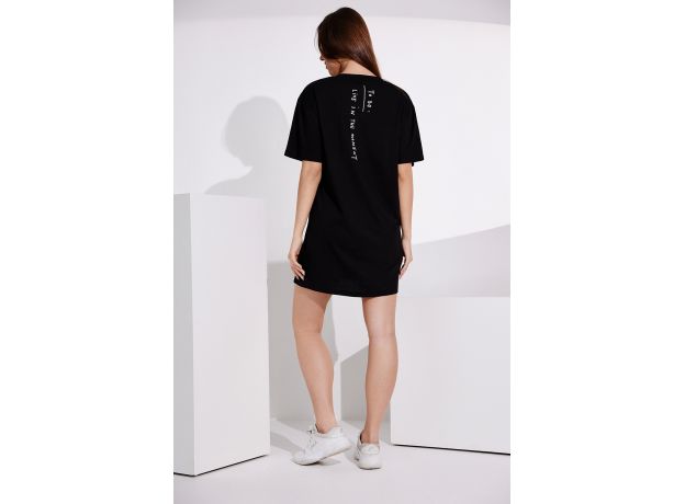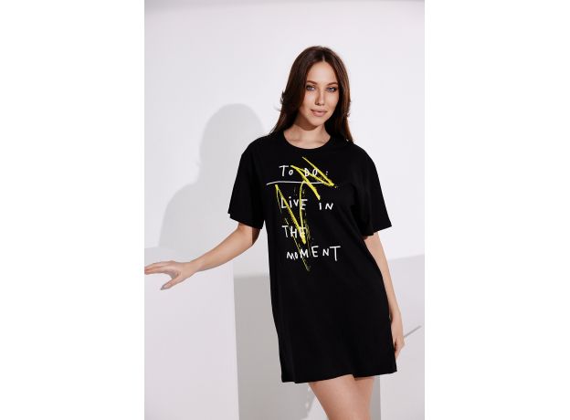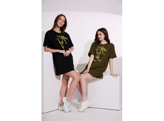 Туника - футболка в стиле оверсайз. Прямая, свободная, длиной выше колена, с округлой горловиной. Рукав короткий. Горловина обработана обтачкой из основного полотна.