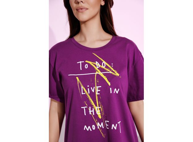 Туника - футболка в стиле оверсайз. Прямая, свободная, длиной выше колена, с округлой горловиной. Рукав короткий. Горловина обработана обтачкой из основного полотна.