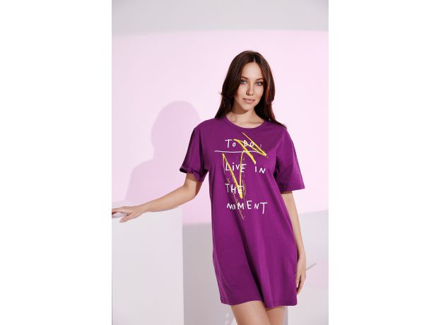 Туника - футболка в стиле оверсайз. Прямая, свободная, длиной выше колена, с округлой горловиной. Рукав короткий. Горловина обработана обтачкой из основного полотна.