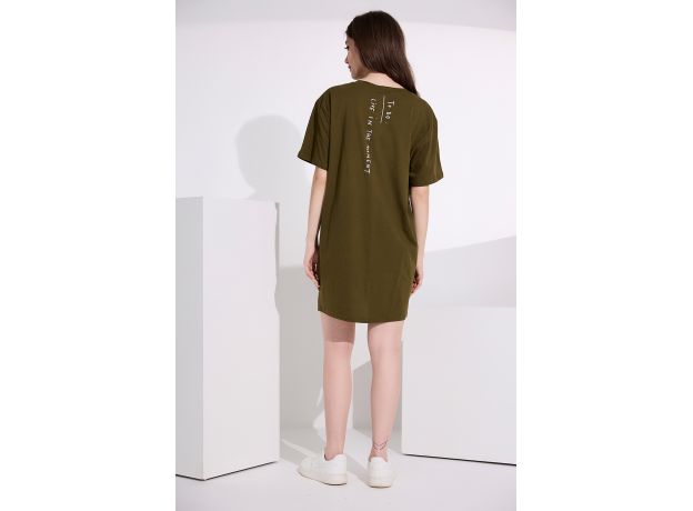 Туника - футболка в стиле оверсайз. Прямая, свободная, длиной выше колена, с округлой горловиной. Рукав короткий. Горловина обработана обтачкой из основного полотна.