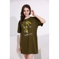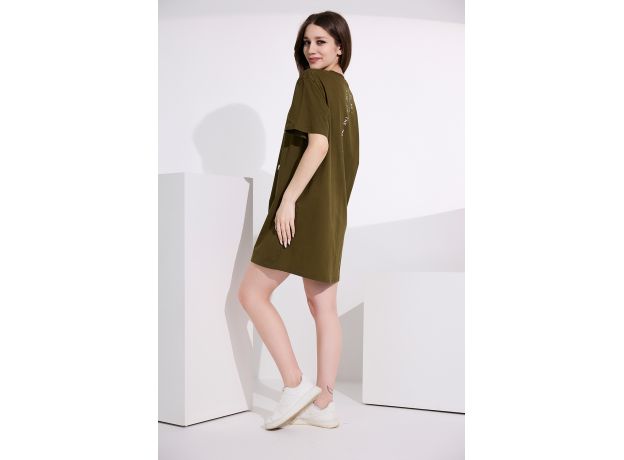 Туника - футболка в стиле оверсайз. Прямая, свободная, длиной выше колена, с округлой горловиной. Рукав короткий. Горловина обработана обтачкой из основного полотна.