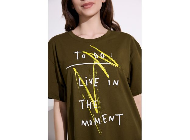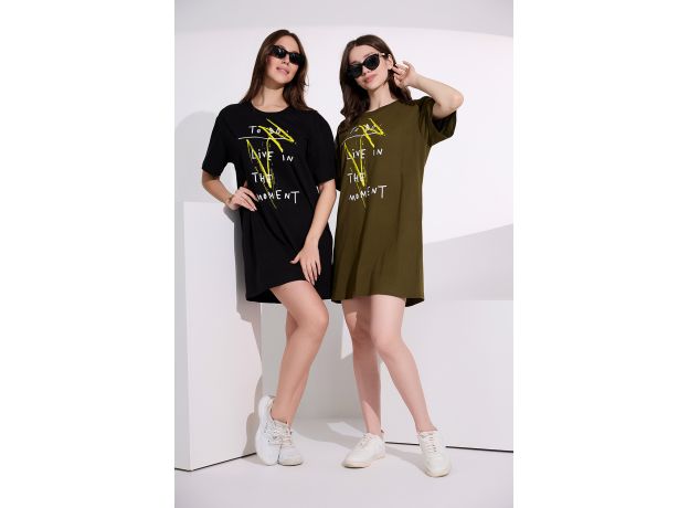 Туника - футболка в стиле оверсайз. Прямая, свободная, длиной выше колена, с округлой горловиной. Рукав короткий. Горловина обработана обтачкой из основного полотна.