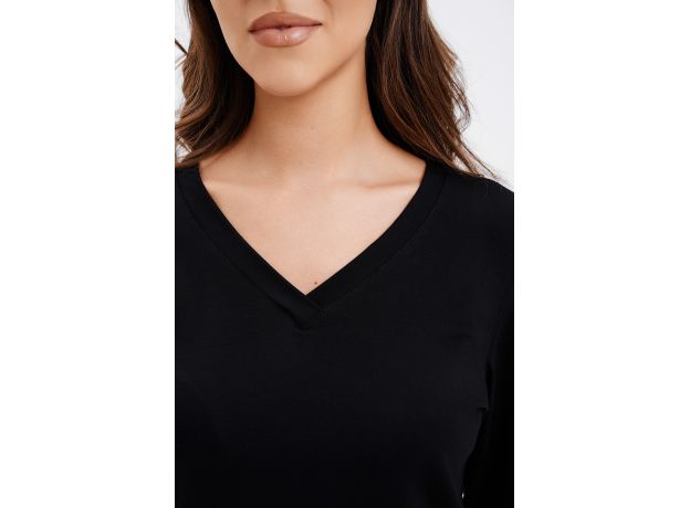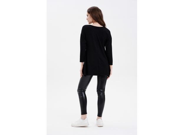 Туника прямого силуэта, с V-образной горловиной, с разрезами в нижней части боковых швов. Спинка удлиненная. Рукав втачной, длинный. Горловина обработана обтачкой из основного полотна.