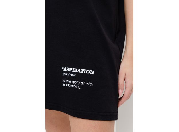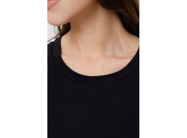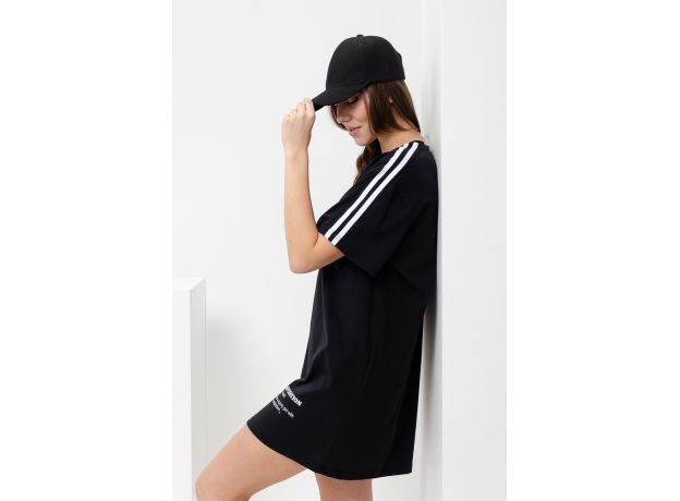 Туника-футболка в стиле оверсайз. Прямая, свободная, длиной выше колена, с округлой горловиной. Рукав короткий. Вдоль плеча и рукава расположена вставка с лампасами контрастного цвета. Горловина обработана обтачкой из основного полотна.