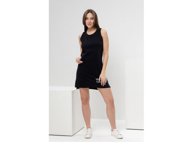 Туника полуприлегающего силуэта, с округлой горловиной, длиной выше колена, без рукавов, с разрезами в нижней части боковых швов. Спинка удлиненная. Горловина обработана обтачкой из основного полотна.