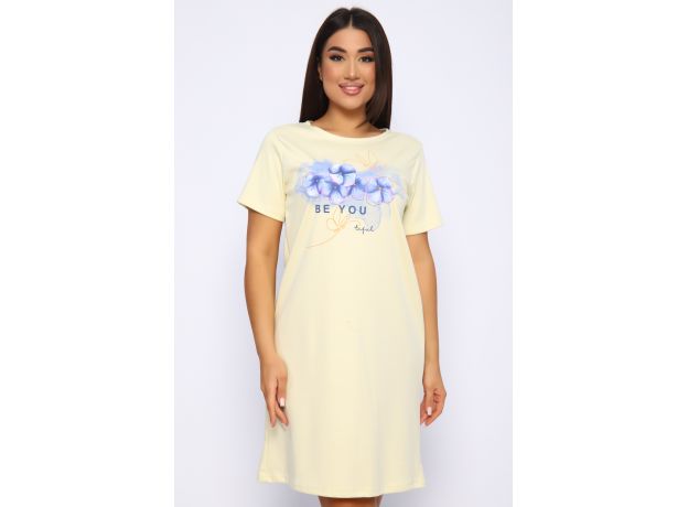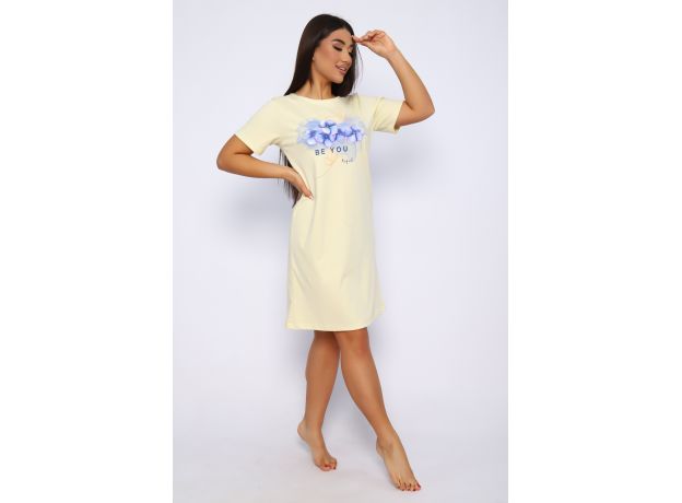 Туника женская из ткани интерлок качества пенье. Нежного желтого цвета с теплым принтом, с карманами, средней длины. Отличный вариант для дома и сна.