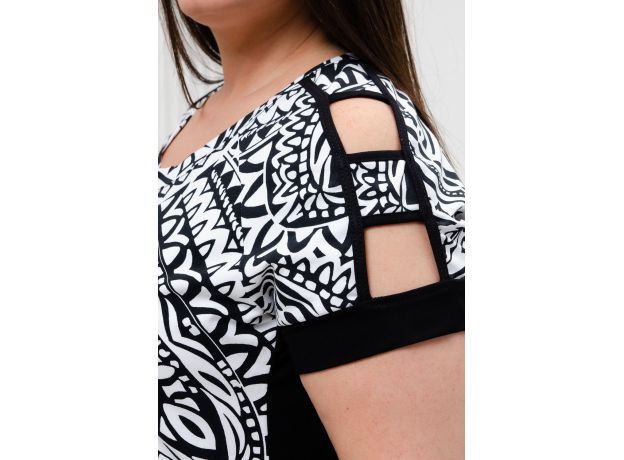 Туника полуприлегающего силуэта, длинной ниже колена, с округлой горловиной, с боковыми карманами. Рукав реглан, короткий, на манжете из отделочного полотна. Вдоль рукава расположены фигурные элементы. Полочка с лампасами из отделочного полотна вдоль боковых швов. Горловина обработана обтачкой из основного полотна.