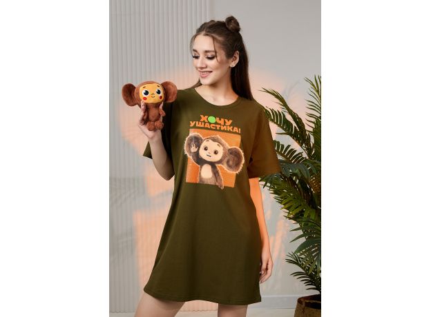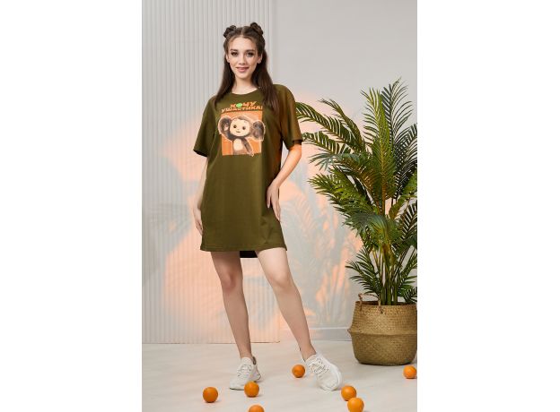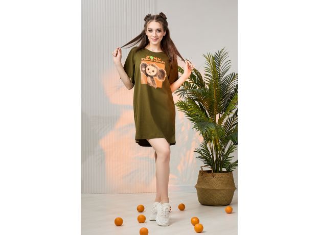 Туника-футболка в стиле оверсайз. Прямая, свободная, длиной выше колена, с округлой горловиной. Рукав короткий. Горловина обработана обтачкой из основного полотна.