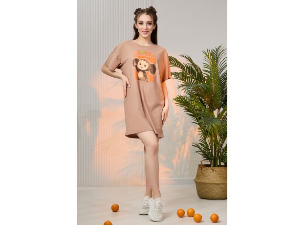 Туника-футболка в стиле оверсайз. Прямая, свободная, длиной выше колена, с округлой горловиной. Рукав короткий. Горловина обработана обтачкой из основного полотна.