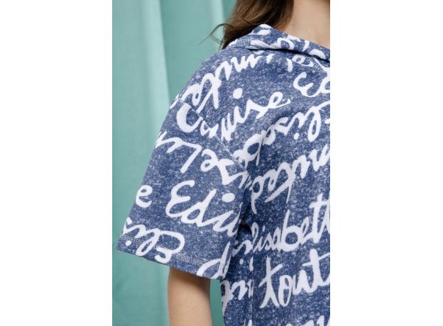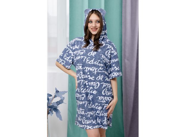 Туника в стиле оверсайз. Прямая, свободная, длиной выше колена, с капюшоном. На капюшоне расположены ушки. Рукав короткий. В нижней части боковых швов обработаны разрезы.