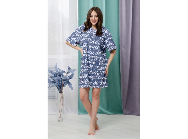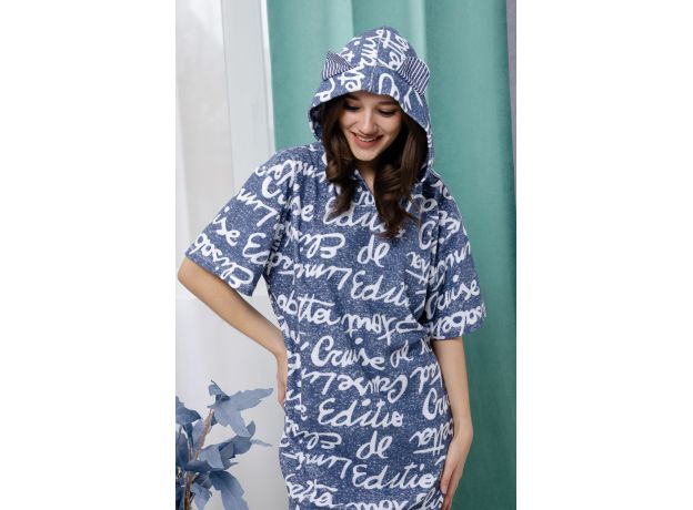 Туника в стиле оверсайз. Прямая, свободная, длиной выше колена, с капюшоном. На капюшоне расположены ушки. Рукав короткий. В нижней части боковых швов обработаны разрезы.