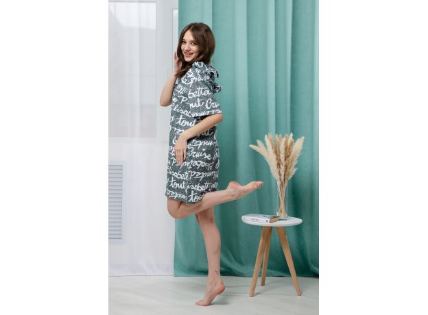 Туника в стиле оверсайз. Прямая, свободная, длиной выше колена, с капюшоном. На капюшоне расположены ушки. Рукав короткий. В нижней части боковых швов обработаны разрезы.