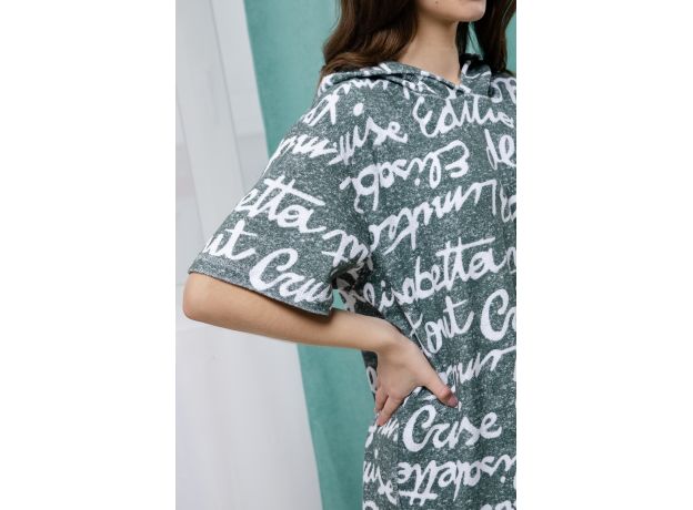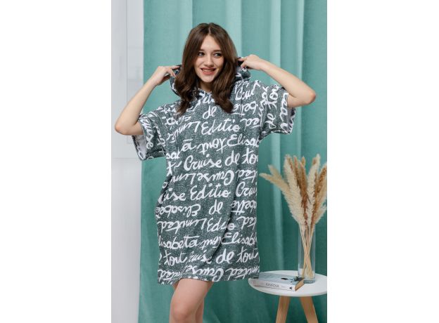 Туника в стиле оверсайз. Прямая, свободная, длиной выше колена, с капюшоном. На капюшоне расположены ушки. Рукав короткий. В нижней части боковых швов обработаны разрезы.
