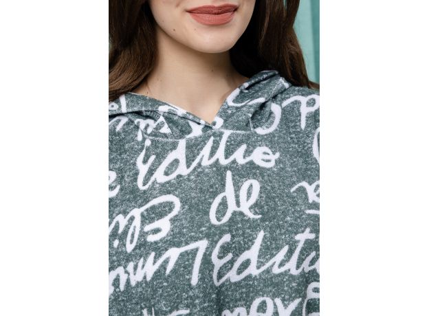 Туника в стиле оверсайз. Прямая, свободная, длиной выше колена, с капюшоном. На капюшоне расположены ушки. Рукав короткий. В нижней части боковых швов обработаны разрезы.