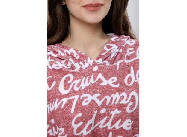 Туника в стиле оверсайз. Прямая, свободная, длиной выше колена, с капюшоном. На капюшоне расположены ушки. Рукав короткий. В нижней части боковых швов обработаны разрезы.