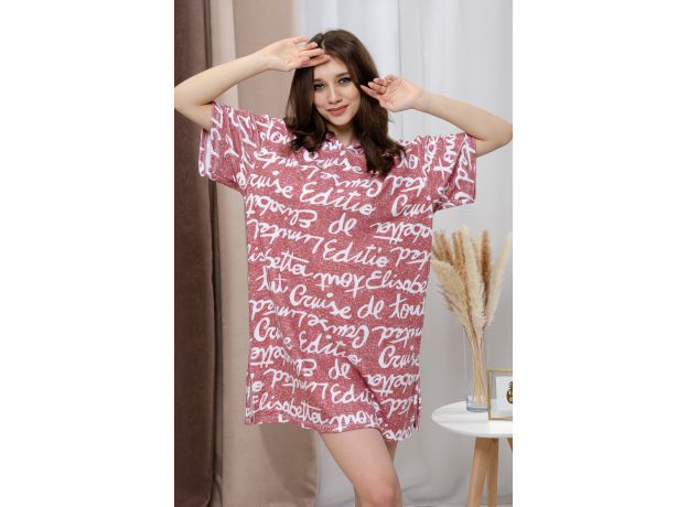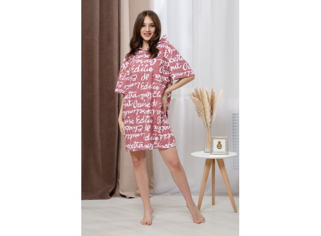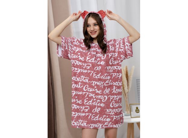 Туника в стиле оверсайз. Прямая, свободная, длиной выше колена, с капюшоном. На капюшоне расположены ушки. Рукав короткий. В нижней части боковых швов обработаны разрезы.