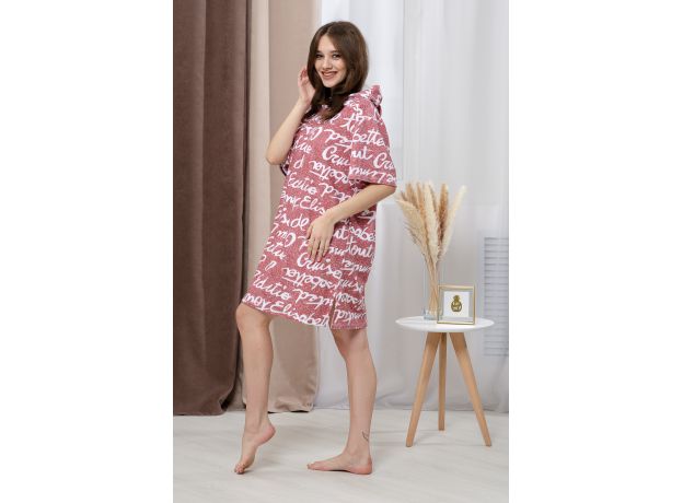 Туника в стиле оверсайз. Прямая, свободная, длиной выше колена, с капюшоном. На капюшоне расположены ушки. Рукав короткий. В нижней части боковых швов обработаны разрезы.