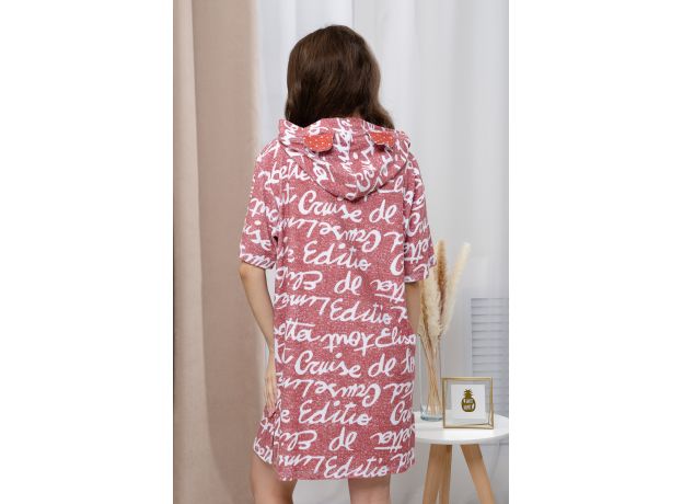 Туника в стиле оверсайз. Прямая, свободная, длиной выше колена, с капюшоном. На капюшоне расположены ушки. Рукав короткий. В нижней части боковых швов обработаны разрезы.