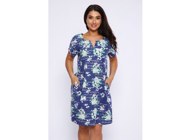 Женская туника из хлопковой ткани с красивой расцветкой. На полочке кокетка с разрезом, который очень интересно смотрится. По боковому шву карман, рукав короткий. Туника прекрасно подойдет для дома, дачи и отдыха.