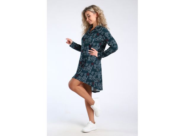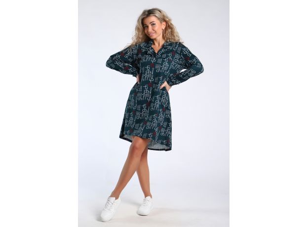 Туника свободного кроя, расклешенная книзу, с удлиненной спинкой и рубашечным воротником. Рукава длинные, на манжетах.