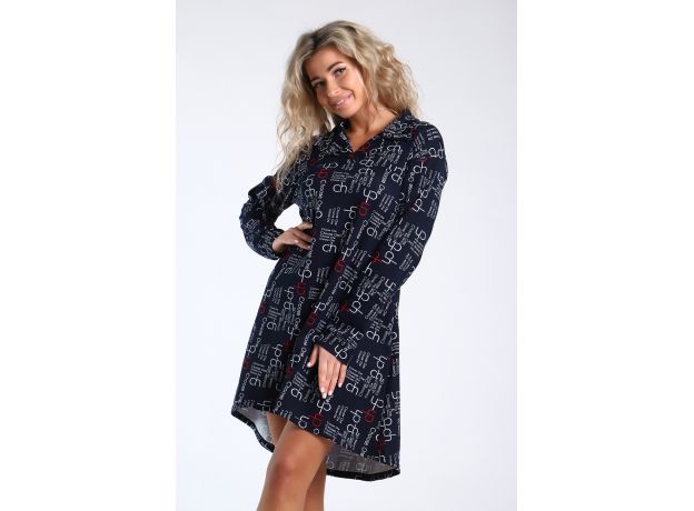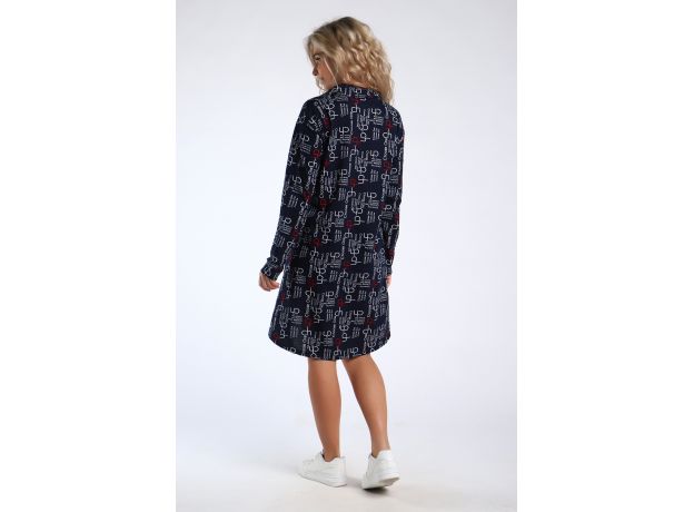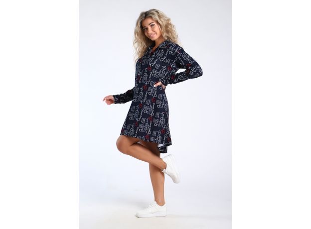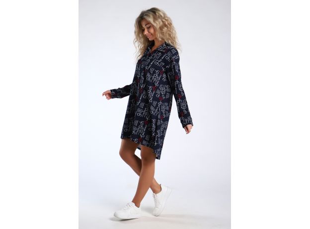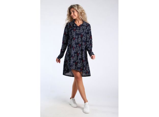 Туника свободного кроя, расклешенная книзу, с удлиненной спинкой и рубашечным воротником. Рукава длинные, на манжетах.