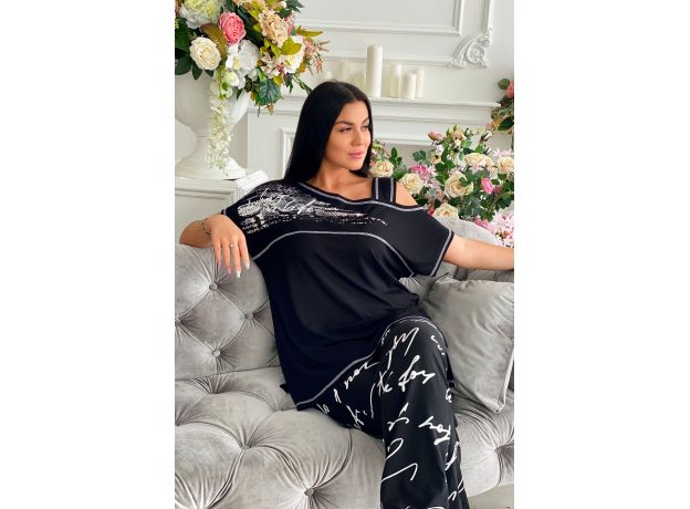 Туника женская полуприлегающего силуэта. Рукав цельнокроенный короткий, с одной стороны бретель на плече, в боковых швах разрезы. В верхней части полочки модный принт.
