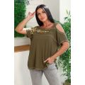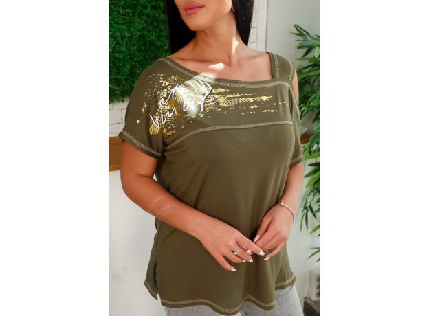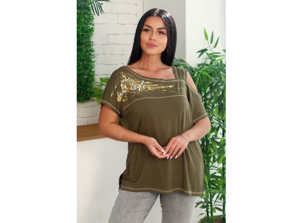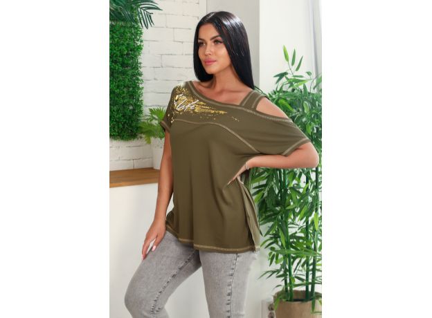 Туника женская полуприлегающего силуэта. Рукав цельнокроеный короткий, с одной стороны бретель на плече, в боковых швах разрезы. В верхней части полочки модный принт.