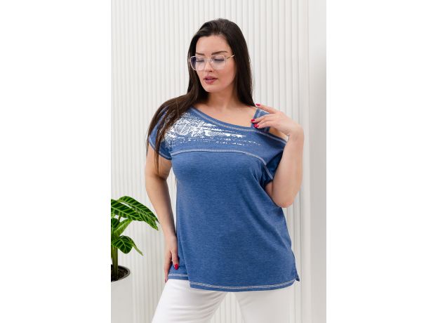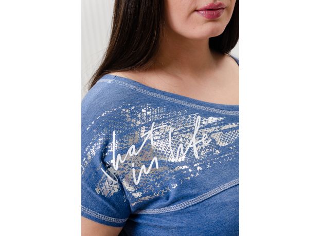 Туника женская полуприлегающего силуэта. Рукав цельнокроеный короткий, с одной стороны бретель на плече, в боковых швах разрезы. В верхней части полочки модный принт.