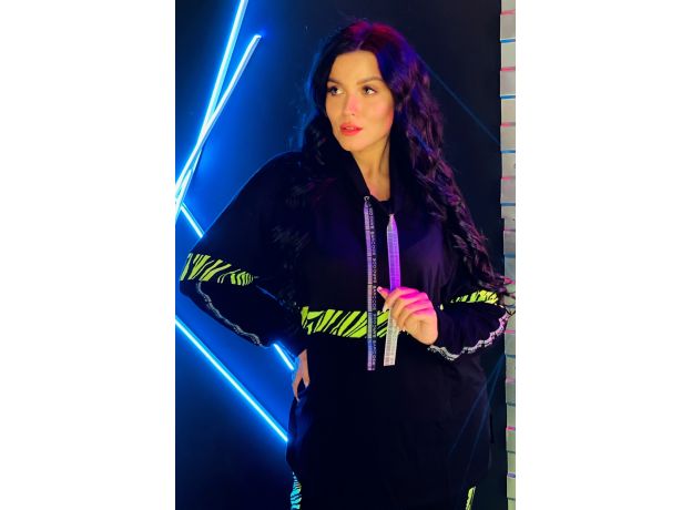 Туника женская прямого силуэта. Рукав цельнокроеный со швом. Воротник-стойка с люверсами и завязками. Верхняя часть полочки и спинки из кашкорсе. Нижняя часть туники из плотной вискозы. Вставки рукавов и полочки из яркой отделочной ткани. В нижней части полочки карман кенгуру.