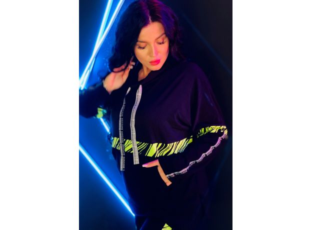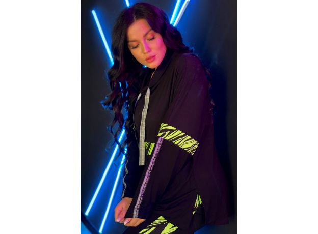 Туника женская прямого силуэта. Рукав цельнокроеный со швом. Воротник-стойка с люверсами и завязками. Верхняя часть полочки и спинки из кашкорсе. Нижняя часть туники из плотной вискозы. Вставки рукавов и полочки из яркой отделочной ткани. В нижней части полочки карман кенгуру.