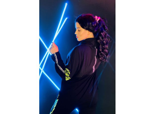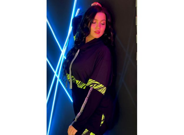 Туника женская прямого силуэта. Рукав цельнокроеный со швом. Воротник-стойка с люверсами и завязками. Верхняя часть полочки и спинки из кашкорсе. Нижняя часть туники из плотной вискозы. Вставки рукавов и полочки из яркой отделочной ткани. В нижней части полочки карман кенгуру.