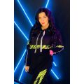 Туника женская прямого силуэта. Рукав цельнокроеный со швом. Воротник-стойка с люверсами и завязками. Верхняя часть полочки и спинки из кашкорсе. Нижняя часть туники из плотной вискозы. Вставки рукавов и полочки из яркой отделочной ткани. В нижней части полочки карман кенгуру.