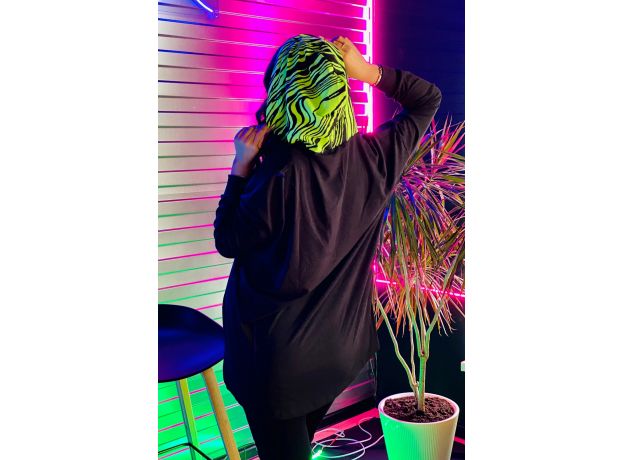 Туника женская прямого силуэта. Рукав цельнокроеный длинный со швом, на манжете. Капюшон и вставка на полочке из отделочной ткани.