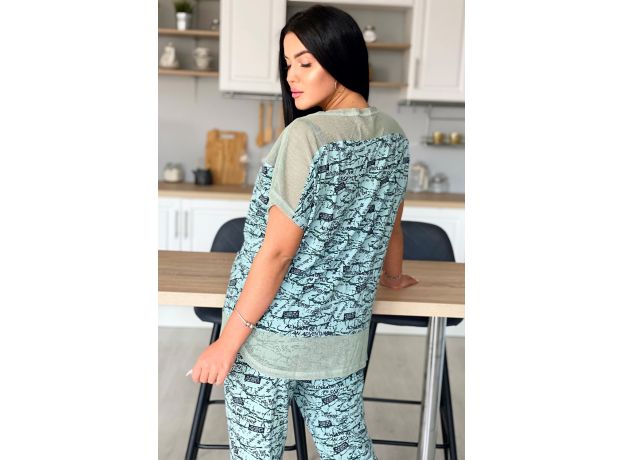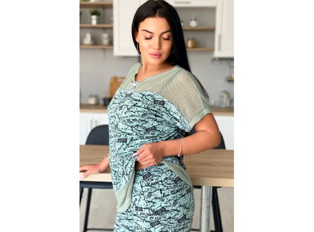 Туника женская прямого силуэта. Рукав цельнокроеный. Кокетка полочки и спинки, низ туники из оливковой хлопковой сетки. В среднем горизонтальном шве полочки два внутренних удобных кармана. В центре кокетка полочки собрана на серебряную тесьму.